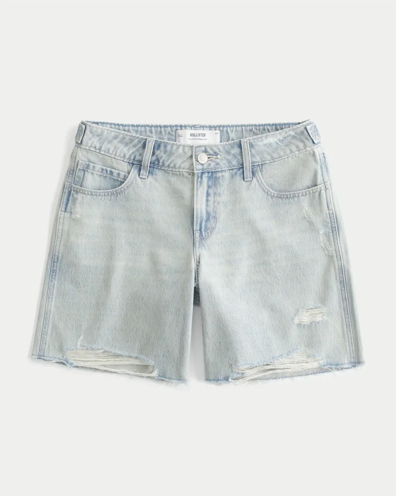Süße und bequeme Jeansshorts in heller Waschung, mit weitem Bein und verstellbarem Bund. 7″ Innennaht, niedrige Leibhöhe.