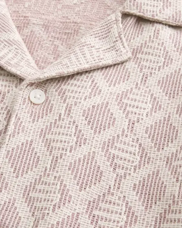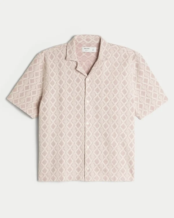 Dieses klassische Hemd mit Knopfleiste aus weichem Stoff im Häkelstil hat ein durchgehendes Rautenmuster und kurze Ärmel. Knopfleiste, Kragen. Boxy Fit.