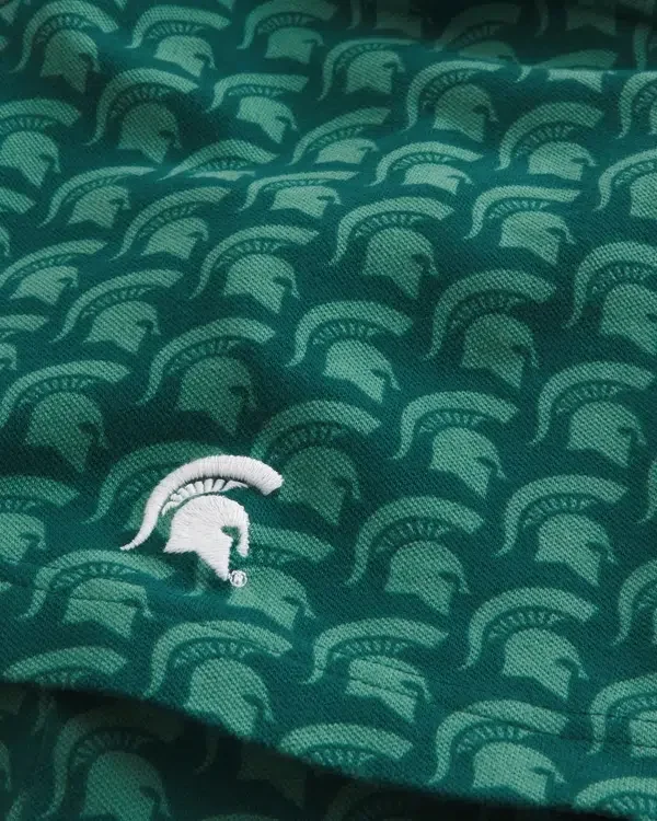 Ein klassisches Polohemd aus weichem Piqué-Stoff mit offiziell lizenzierter Michigan State University-Grafikstickerei auf der linken Brust und dem linken Ärmel. Knopfleiste, kurze Ärmel, Kragen