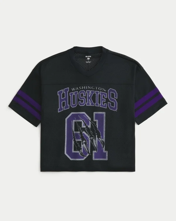 Dieses klassische Football-Trikot ist aus weichem Mesh-Material gefertigt und mit offiziell lizenzierten Druckgrafiken der University of Washington versehen. V-Ausschnitt, kurze Ärmel. Baggy Crop Fit.