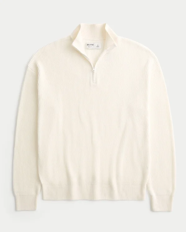 Ein superweicher und bequemer Strickpullover mit Stehkragen und Viertelreißverschluss. Lange Ärmel. Boxy Fit.